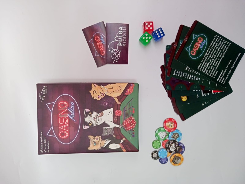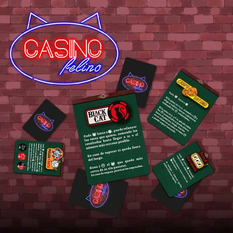 Casino Felino es un juego de hasta 6 jugadores de partidas rápidas llenas de azar y astucia donde los gatos visitan por la noche un casino de dados.
